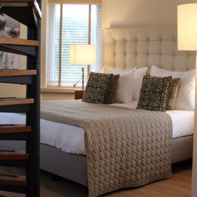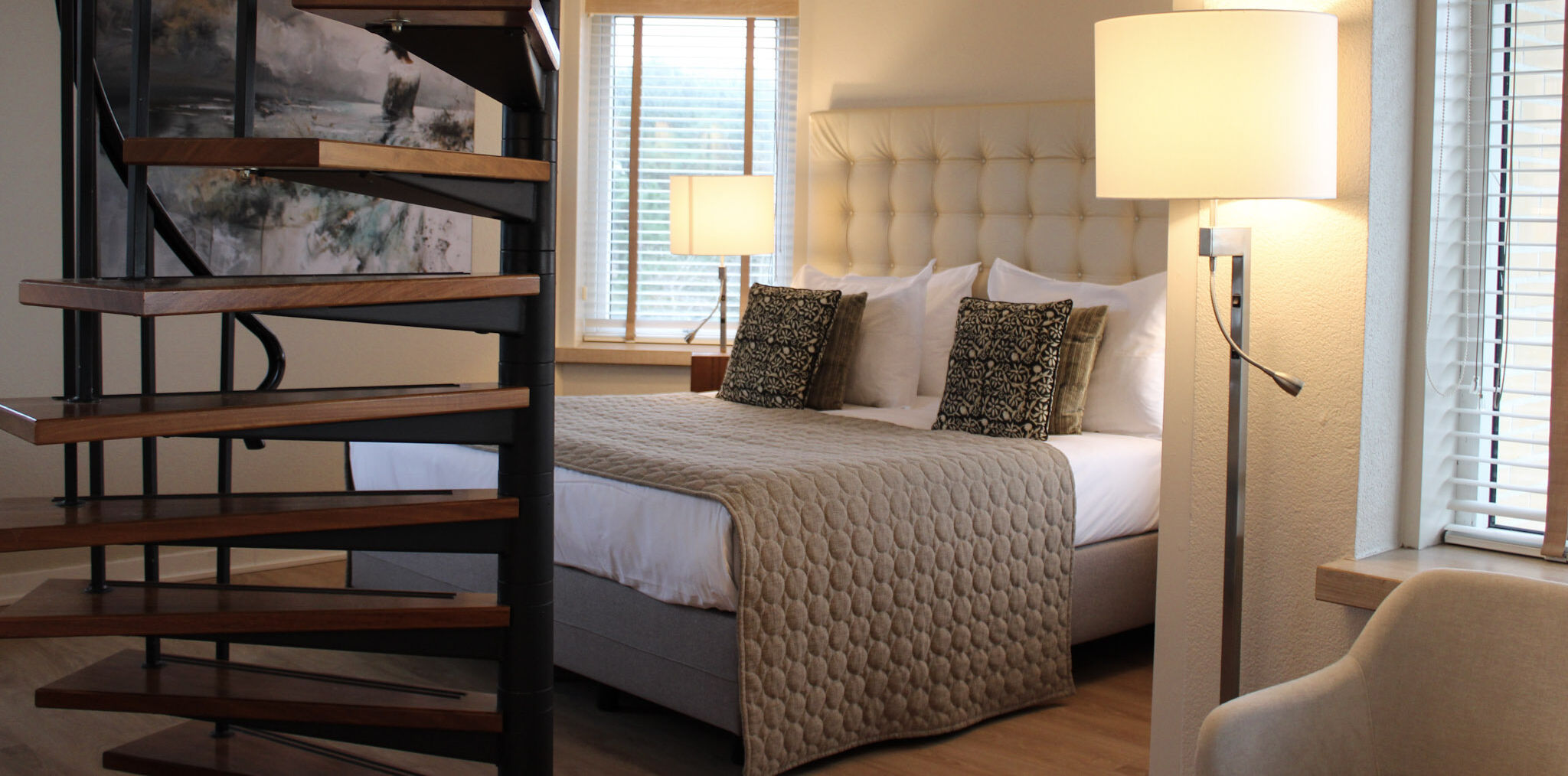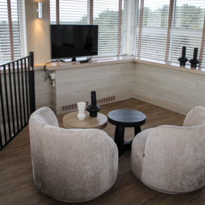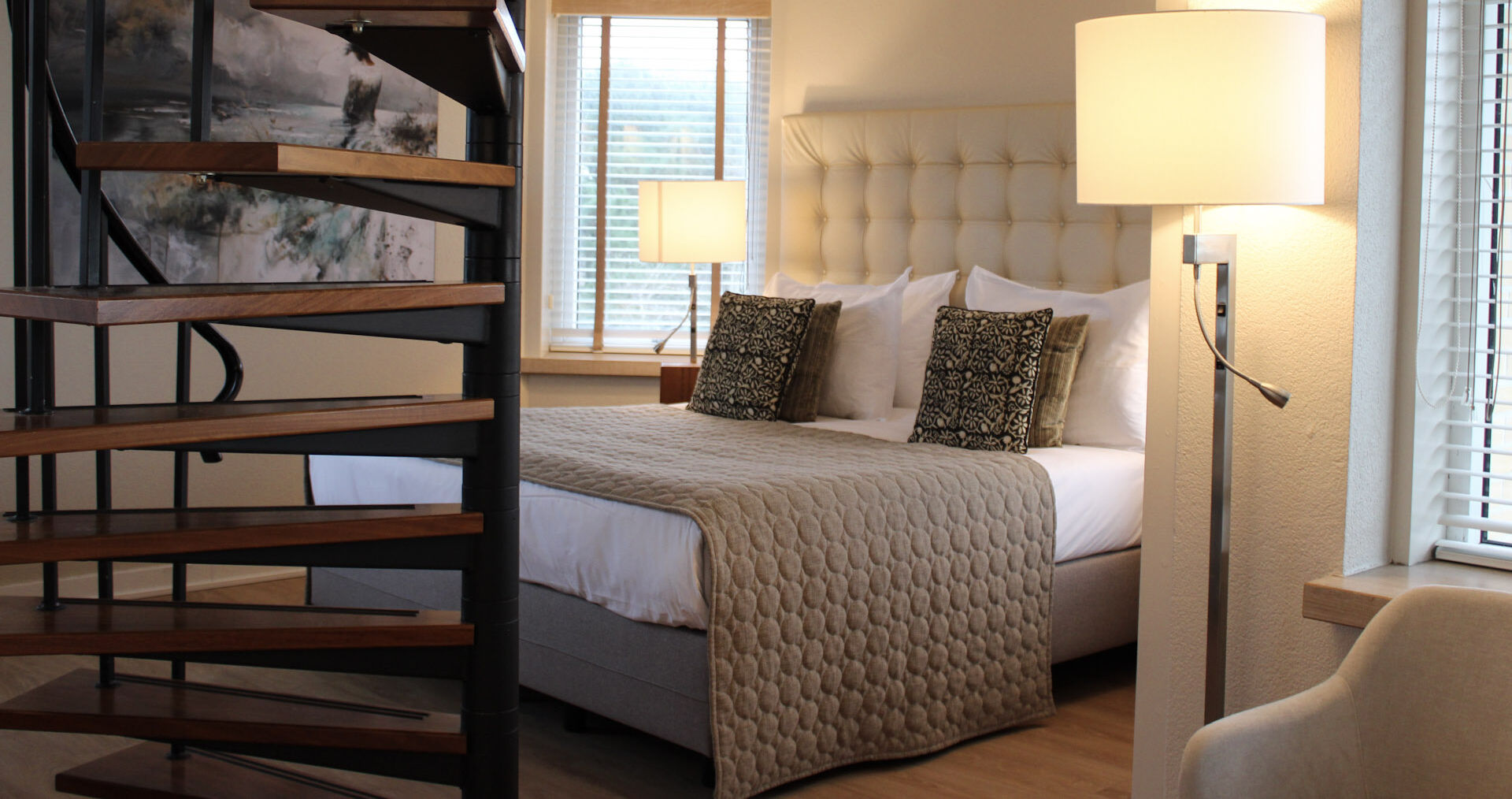 Luxe Suite met tweepersoonsbed, ruime zithoek (in de toren) met uitzicht over de Waddenzee, open badkamer met whirpool en een apart toilet, balkon, gratis wifi, airco, bureau, föhn, kluis, flatscreen TV, mini-koelkast, radio, roomservice, telefoon, espressoapparaat, waterkoker. Een oppervlakte van 40 m².